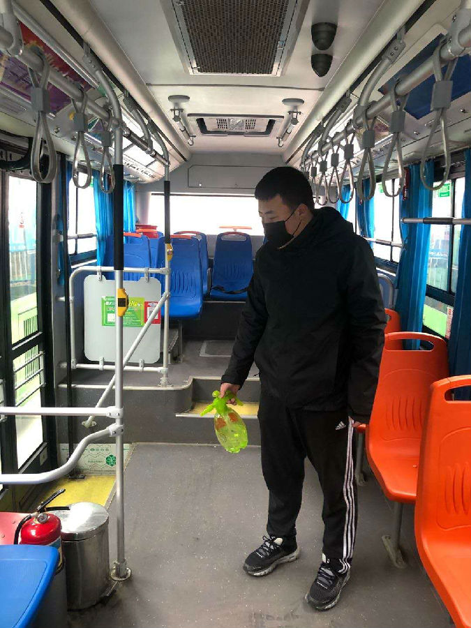 出車前的疫情防控培訓(xùn),他囑咐大家時(shí)刻繃緊弦兒,疫情之際,發(fā)車之前都要準(zhǔn)備好、肩負(fù)起一系列緊要而瑣碎的事務(wù)。羅霄將隨車消殺物品發(fā)放下去,同時(shí)與大家一起,對(duì)出場(chǎng)前的車輛里里外外進(jìn)行全面的噴灑、擦拭消毒。他一邊忙碌一邊監(jiān)督,不放過任何一個(gè)死角和細(xì)節(jié),“特殊時(shí)期,這事兒不能馬虎!必須嚴(yán)格按照要求消毒,保證車上人員安全!