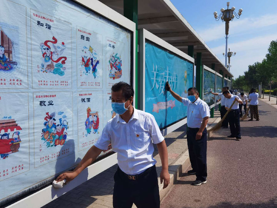 宣誓后,黨員志愿者奔赴路口和公交站亭進(jìn)行了交通疏導(dǎo)、公交站亭清理等志愿服務(wù)活動(dòng)。