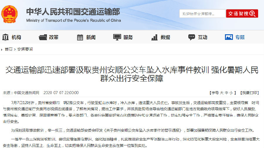 會議首先通報了7月7日“貴州安順公交車墜入水庫事件”的主要經(jīng)過和相關(guān)后續(xù)跟蹤情況,同時傳達了交通運輸部安委會印發(fā)《關(guān)于貴州安順公交車墜入水庫事件的警示通報》中,部署加強暑期保障人民群眾出行安全工作的重要指示精神: