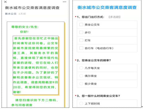 一是自8月21日至9月20日在“衡水公交微信公眾”發(fā)布“乘客滿意度和征求提高公交實(shí)載率調(diào)查問(wèn)卷活動(dòng)”,市民可通過(guò)掃描識(shí)別“衡水城市公交乘客滿意度調(diào)查”二維碼,參與問(wèn)卷調(diào)查。